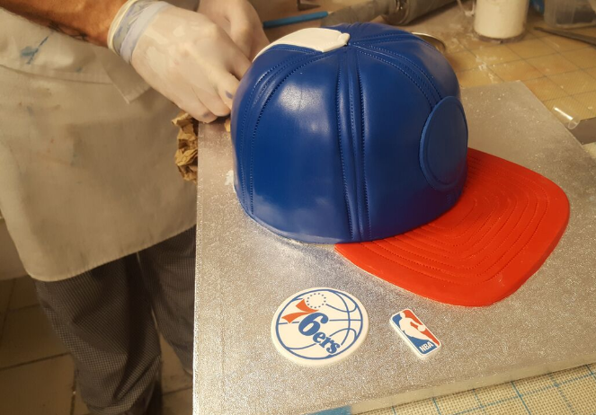 We had so much fun making this awesome Sixers Hat Cake! We put a lot of detail into the hat to give it an authentic feel, including the stitching around the panels and brim, vibrant red eyelets, and hand-cut lettering.
